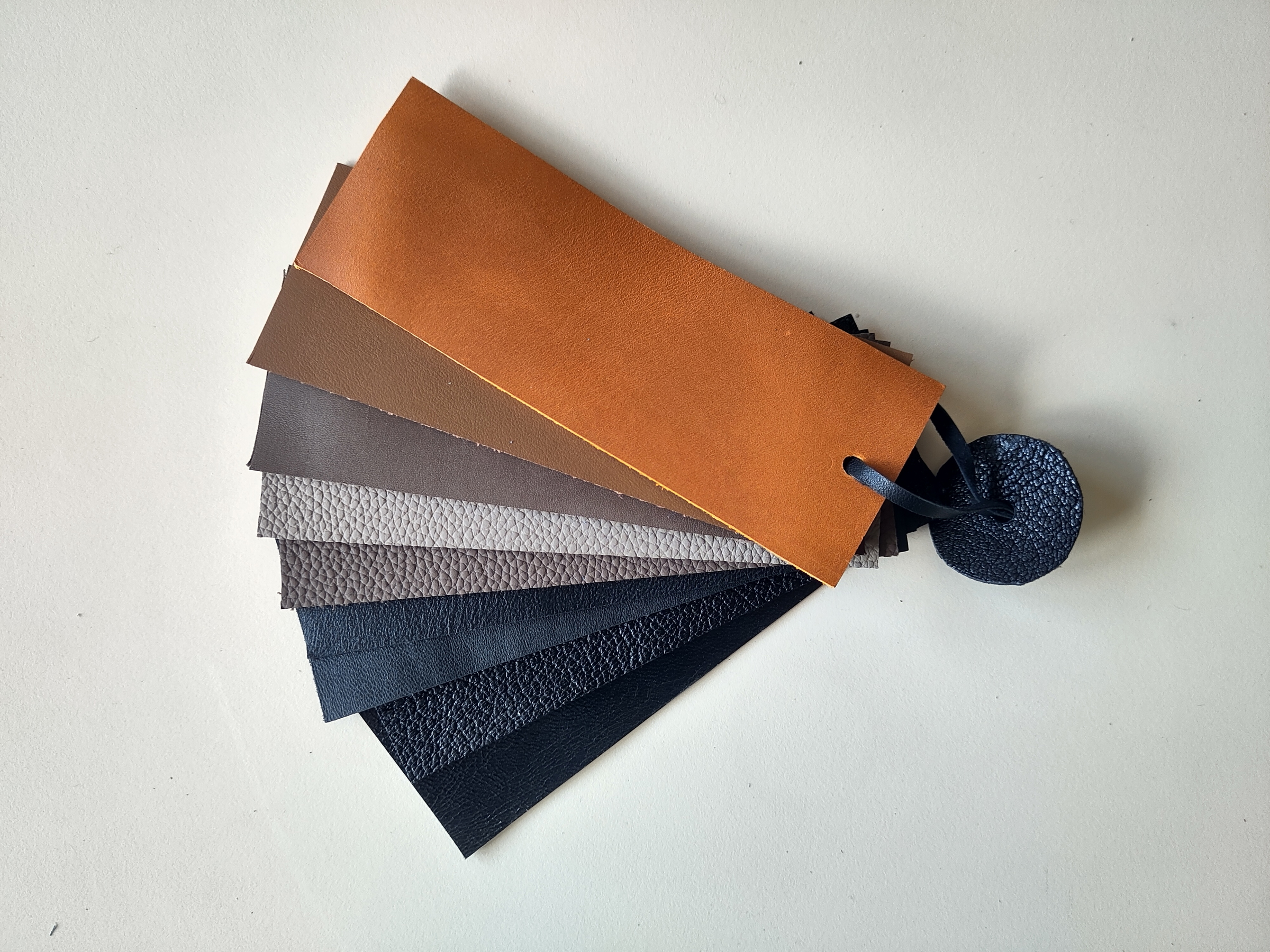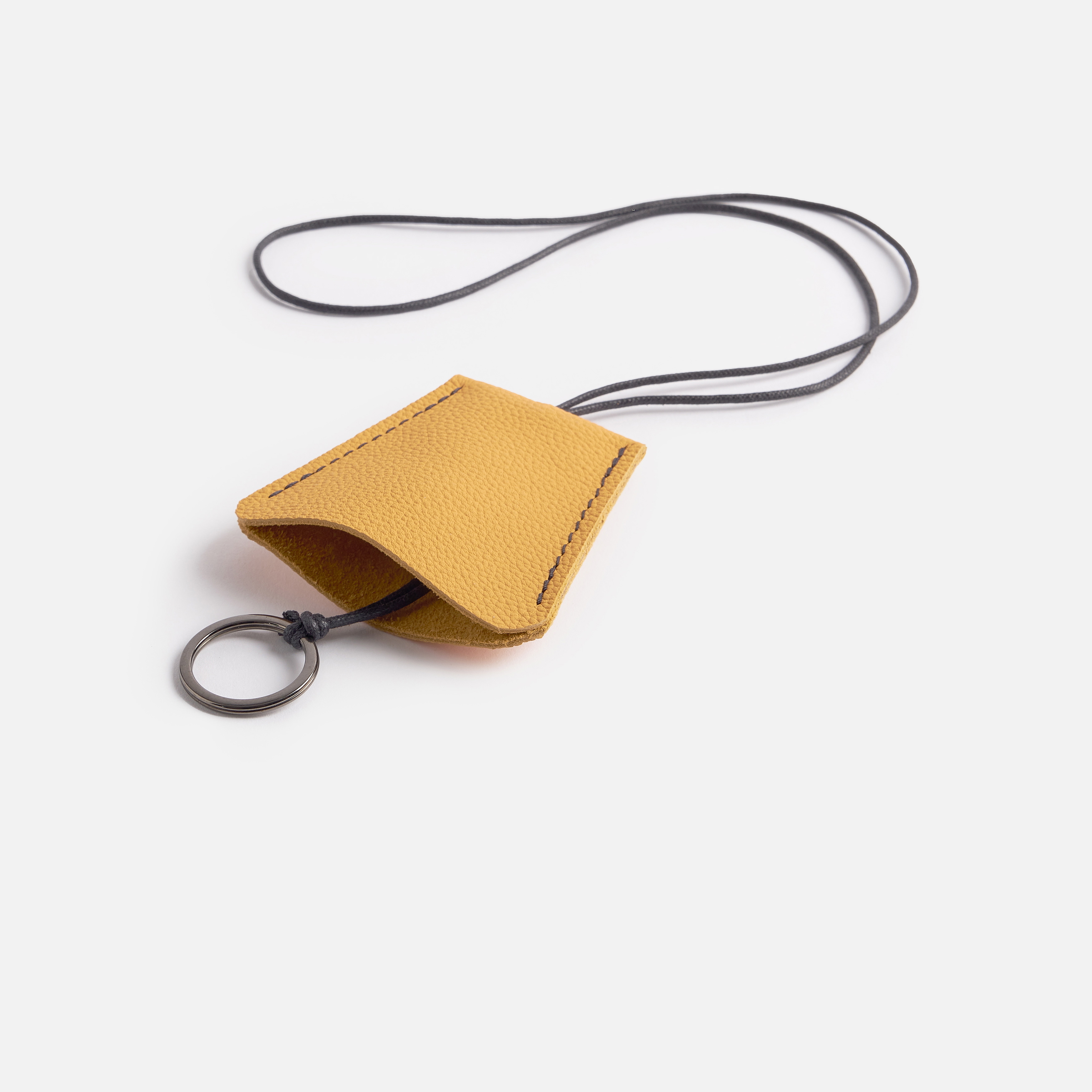 MATIÈRES : Nous avons choisi pour ce porte-clé de très beaux cuirs lisses ou grainés agrémentés d’un cordon en coton enduit noir(TBC). Anneau brisé métallique canon de fusil.